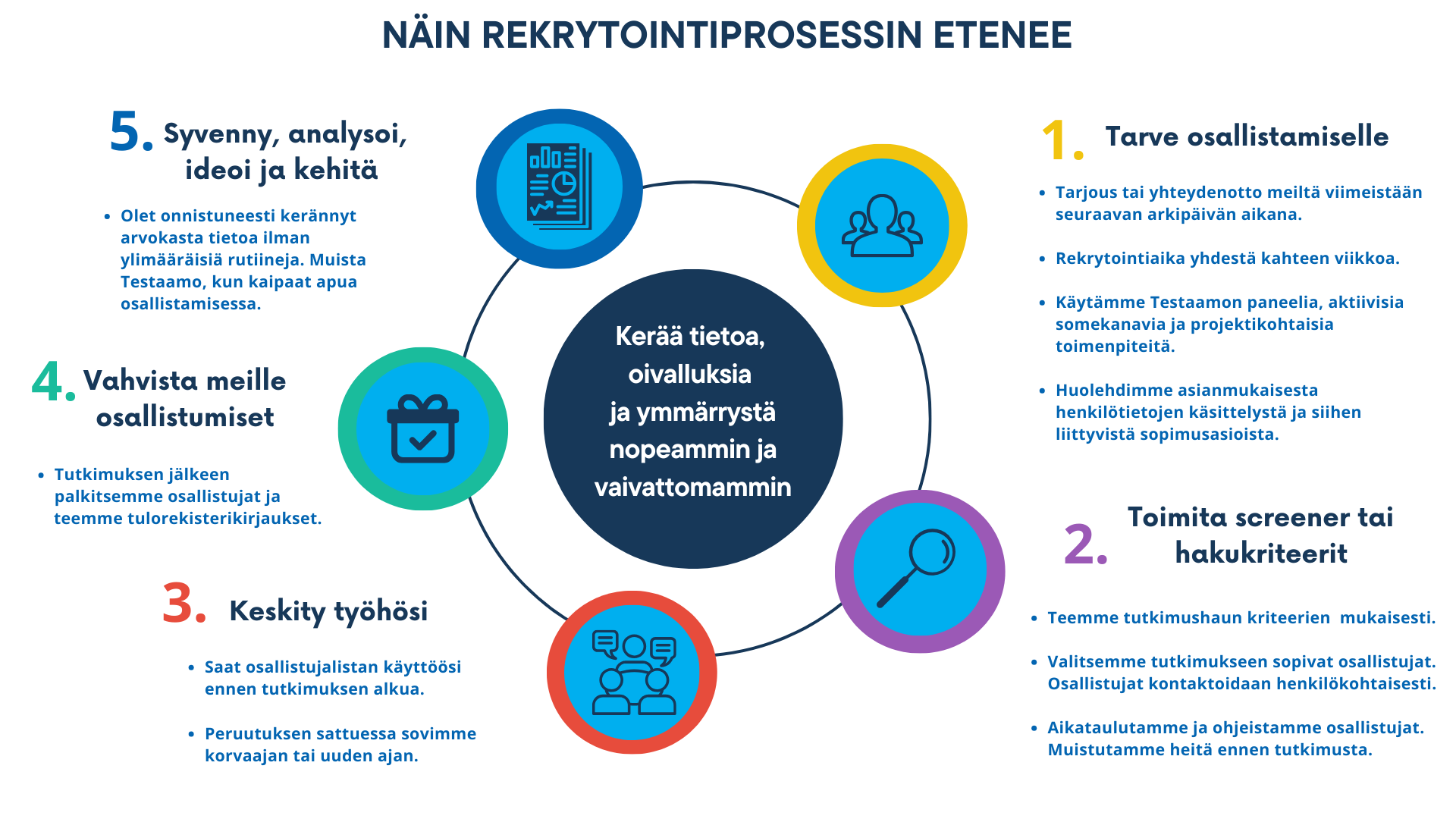 Mikä on kohderyhmäsi? Testaamon kautta tavoitat kymmeniätuhansia suomalaisia. Toteuta käyttäjätestit, fokusryhmät, haastattelut ja workshopit. Valitse etänä tai paikan päällä. Löydämme kriteeriesi mukaiset osallistujat, buukkamme ja ohjeistamme. Tutkimuksen jälkeen hoidamme palkkiot ja myös ne viralliset tulorekisteri-ilmoitukset.